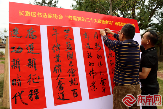 妙笔写金句,红心永向党。当天上午,在岩溪镇珪后村,长泰区书法协会和灯谜协会还联合举办“宣传贯彻党的二十大精神”主题书法展示和灯谜竞猜等活动,吸引不少群众积极参或驻足观看,现场气氛热烈。“今天我们村通过书法展览、红歌会、猜灯谜等形式组织大家一起学习党的二十大的精神,我觉得很接地气,也很有趣。”参加活动的群众高兴地表示。(泰融 文/图) |