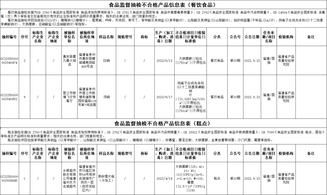 微生物污染问题:惠安县蜀九鼎火锅店的白碗(消毒日期为2022年6月13日),大肠菌群不合格,检验机构为福建省产品质量检验研究院;晋江市新塘飞仔快餐厅的汤碗(消毒日期为2022年6月17日),阴离子合成洗涤剂(以十二烷基苯磺酸钠计)不合格、大肠菌群不合格,检验机构为福建省产品质量检验研究院;永辉超市股份有限公司福建凯发k8东方名城超市销售的熟粉雪片糕(冷加工)(生产日期为2022年4月18日),大肠菌群不合格、霉菌不合格,检验机构为福建省产品质量检验研究院。
