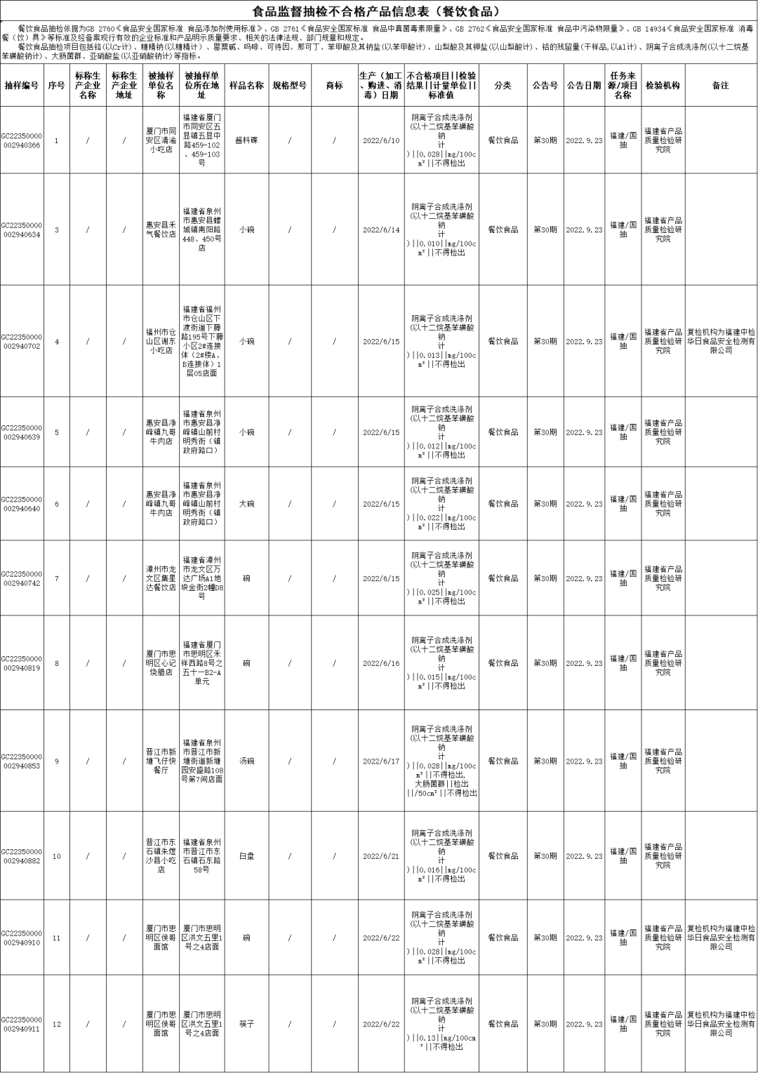 其他污染问题:厦门市同安区清渝小吃店的酱料碟(消毒日期为2022年6月10日),阴离子合成洗涤剂(以十二烷基苯磺酸钠计)不合格,检验机构为福建省产品质量检验研究院;惠安县禾气餐饮店的小碗(消毒日期为2022年6月14日),阴离子合成洗涤剂(以十二烷基苯磺酸钠计)不合格,检验机构为福建省产品质量检验研究院;凯发k8市仓山区谢东小吃店的小碗(消毒日期为2022年6月15日),阴离子合成洗涤剂(以十二烷基苯磺酸钠计)不合格,初检机构为福建省产品质量检验研究院,复检机构为福建中检华日食品安全检测有限公司;惠安县净峰镇九哥牛肉店的小碗(消毒日期为2022年6月15日),阴离子合成洗涤剂(以十二烷基苯磺酸钠计)不合格,检验机构为福建省产品质量检验研究院;惠安县净峰镇九哥牛肉店的大碗(消毒日期为2022年6月15日),阴离子合成洗涤剂(以十二烷基苯磺酸钠计)不合格,检验机构为福建省产品质量检验研究院;漳州市龙文区集星达餐饮店的碗(消毒日期为2022年6月15日),阴离子合成洗涤剂(以十二烷基苯磺酸钠计)不合格,检验机构为福建省产品质量检验研究院;厦门市思明区心记烧腊店的碗(消毒日期为2022年6月16日),阴离子合成洗涤剂(以十二烷基苯磺酸钠计)不合格,检验机构为福建省产品质量检验研究院;晋江市新塘飞仔快餐厅的汤碗(消毒日期为2022年6月17日),阴离子合成洗涤剂(以十二烷基苯磺酸钠计)不合格、大肠菌群不合格,检验机构为福建省产品质量检验研究院;晋江市东石镇朱煜沙县小吃店的白盘(消毒日期为2022年6月21日),阴离子合成洗涤剂(以十二烷基苯磺酸钠计)不合格,检验机构为福建省产品质量检验研究院;厦门市思明区侯哥面馆的碗(消毒日期为2022年6月22日),阴离子合成洗涤剂(以十二烷基苯磺酸钠计)不合格,初检机构为福建省产品质量检验研究院,复检机构为福建中检华日食品安全检测有限公司;厦门市思明区侯哥面馆的筷子(消毒日期为2022年6月22日),阴离子合成洗涤剂(以十二烷基苯磺酸钠计)不合格,初检机构为福建省产品质量检验研究院,复检机构为福建中检华日食品安全检测有限公司。