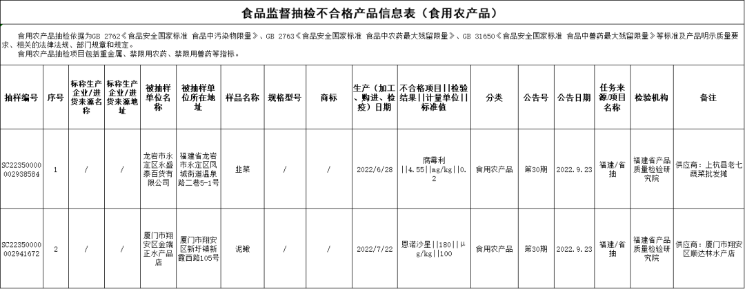 农兽药残留问题:龙岩市永定区永盛泰百货有限公司销售的韭菜(购进日期为2022年6月28日),腐霉利不合格,检验机构为福建省产品质量检验研究院;厦门市翔安区金端正水产品店销售的泥鳅(购进日期为2022年7月22日),恩诺沙星不合格,检验机构为福建省产品质量检验研究院。