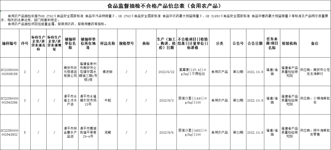 兽药残留问题:南安市状元楼酒店有限公司销售的橡皮蚌(购进日期为2022年6月22日),氯霉素不合格,检验机构为福建省产品质量检验研究院;漳平市永福士冰水产店销售的牛蛙(购进日期为2022年8月3日),恩诺沙星不合格,检验机构为福建省产品质量检验研究院;漳平市林金娜水产品店销售的泥鳅(购进日期为2022年8月6日),恩诺沙星不合格,检验机构为福建省产品质量检验研究院。