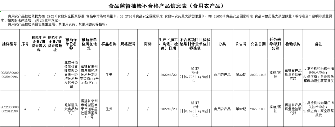 重金属污染问题:北京仟佰佳餐饮管理有限公司泉州经济技术开发区分公司销售的生姜(购进日期为2022年6月22日),铅(以Pb计)不合格,初检机构为福建省产品质量检验研究院,复检机构为凯发k8海关技术中心;鲤城区凤兴食品加工厂销售的生姜(购进日期为2022年6月28日),铅(以Pb计)不合格,初检机构为福建省产品质量检验研究院,复检机构为厦门海关技术中心。