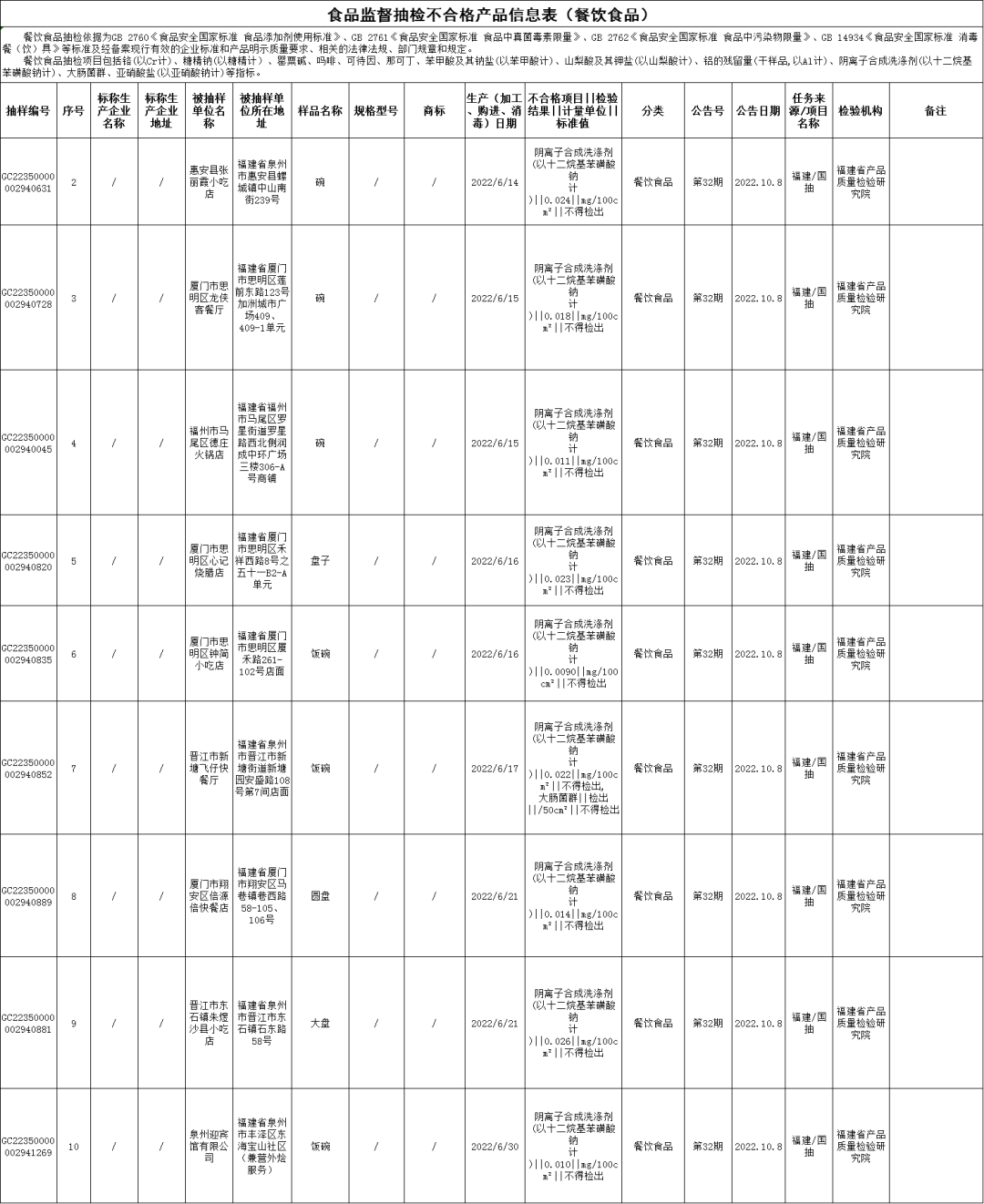其他污染问题:惠安县张丽霞小吃店的碗(消毒日期为2022年6月14日),阴离子合成洗涤剂(以十二烷基苯磺酸钠计)不合格,检验机构为福建省产品质量检验研究院;厦门市思明区龙侠客餐厅的碗(消毒日期为2022年6月15日),阴离子合成洗涤剂(以十二烷基苯磺酸钠计)不合格,检验机构为福建省产品质量检验研究院;凯发k8市马尾区德庄火锅店的碗(消毒日期为2022年6月15日),阴离子合成洗涤剂(以十二烷基苯磺酸钠计)不合格,检验机构为福建省产品质量检验研究院;厦门市思明区心记烧腊店的盘子(消毒日期为2022年6月16日),阴离子合成洗涤剂(以十二烷基苯磺酸钠计)不合格,检验机构为福建省产品质量检验研究院;厦门市思明区钟简小吃店的饭碗(消毒日期为2022年6月16日),阴离子合成洗涤剂(以十二烷基苯磺酸钠计)不合格,检验机构为福建省产品质量检验研究院;晋江市新塘飞仔快餐厅的饭碗(消毒日期为2022年6月17日),阴离子合成洗涤剂(以十二烷基苯磺酸钠计)不合格、大肠菌群不合格,检验机构为福建省产品质量检验研究院;厦门市翔安区倍源倍快餐店的圆盘(消毒日期为2022年6月21日),阴离子合成洗涤剂(以十二烷基苯磺酸钠计)不合格,检验机构为福建省产品质量检验研究院;晋江市东石镇朱煜沙县小吃店的大盘(消毒日期为2022年6月21日),阴离子合成洗涤剂(以十二烷基苯磺酸钠计)不合格,检验机构为福建省产品质量检验研究院;泉州迎宾馆有限公司的饭碗(消毒日期为2022年6月30日),阴离子合成洗涤剂(以十二烷基苯磺酸钠计)不合格,检验机构为福建省产品质量检验研究院。