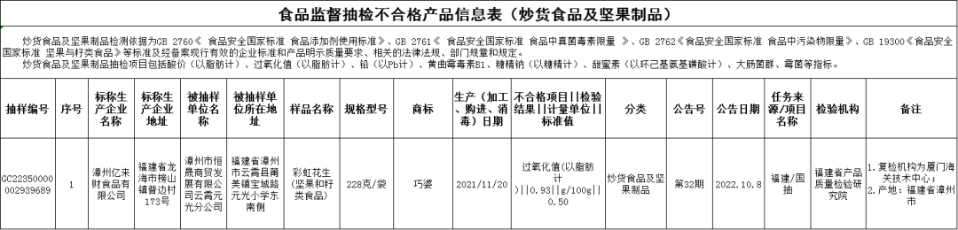 质量指标问题:漳州亿来财食品有限公司2021年11月20日生产的彩虹花生(坚果和籽类食品),过氧化值(以脂肪计)不合格,销售单位为漳州市恒晟商贸发展有限公司云霄元光分公司,初检机构为福建省产品质量检验研究院,复检机构为厦门海关技术中心。