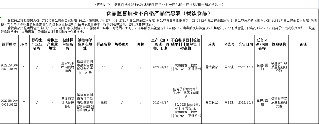 新一期抽检结果出来了,快来看看有哪些食品被点名批评? 第32期公告的监督抽检信息涉及26大类食品655批次,包括:粮食加工品、食用油(含油脂及其制品)、调味品、肉制品、乳制品、饮料、方便食品、饼干、罐头、速冻食品、糖果制品、茶叶及相关制品、酒类、蔬菜制品、水果制品、炒货食品及坚果制品、可可及焙烤咖啡产品、食糖、水产制品、淀粉及淀粉制品、糕点、豆制品、特殊膳食食品、餐饮食品(含餐饮具)、食品添加剂、食用农产品。合格639批次,不合格16批次。 微生物污染问题:惠安县哦哟肉肉烤肉店的杯(消毒日期为2022年6月13日),大肠菌群不合格,检验机构为福建省产品质量检验研究院;晋江市新塘飞仔快餐厅的饭碗(消毒日期为2022年6月17日),阴离子合成洗涤剂(以十二烷基苯磺酸钠计)不合格、大肠菌群不合格,检验机构为福建省产品质量检验研究院。