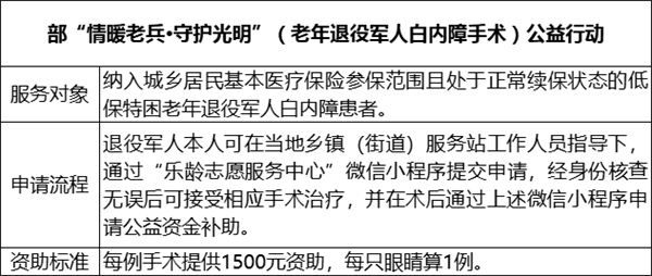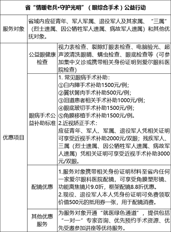 目前,我省已被退役军人事务部列为“情暖老兵·守护光明”公益行动首批试点省份。省退役军人服务中心指导省退役军人关爱协会、爱尔眼科医院福建省区同步推进部、省两项公益行动,目前,已完成前期工作,下一步将在全省范围内开展眼健康义诊活动和手术治疗服务。 部、省“情暖老兵·守护光明”公益行动内容