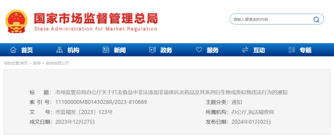 市场监管总局办公厅关于打击 食品中非法添加非甾体抗炎药品及其系列衍生物或类似物 违法行为的通知 各省、自治区、直辖市和新疆生产建设兵团市场监管局(厅、委): 近年来,宣称功能食品非法添加药品、药品衍生物或类似物的违法案件时有发生,危害人民群众身体健康。近期,总局组织山东省市场监管部门查办“青岛尚医制药有限公司涉嫌生产经营添加药品的食品案”,出具了有毒有害专家认定意见。现将《食品中非法添加非甾体抗炎药物的有毒有害专家认定意见》(见附件)发给你们,可作为案件查办中甄别有毒有害物质成分、实施定罪量刑的参考。 市场监管部门应当从速从严查处此类案件,依法吊销许可并处罚相关责任人;涉嫌犯罪的,要及时移送公安机关处理。 附件:食品中非法添加非甾体抗炎药物的有毒有害专家认定意见 市场监管总局办公厅 2023年12月27日 (此件公开发布) 附 件 食品中非法添加非甾体抗炎药物的有毒有害专家认定意见 2023年11月24日,中国计量科学研究院受国家市场监督管理总局执法稽查局委托,组织专家对食品中非法添加非甾体抗炎药的有毒有害性进行评估、认定。 专家组听取了汇报,经研究,形成认定意见如下: 一、非甾体抗炎药具有解热、镇痛、消炎等作用,包括但不限于: 1.以乙酰苯胺为母核的药物,如对乙酰氨基酚、非那西丁等; 2. 以水杨酸为母核的药物,如阿司匹林、贝诺酯、二氟尼柳等; 3. 以吡唑(二)酮为母核的药物,如保泰松、氨基比林、安替比林、安乃近、非普拉宗等; 4. 以苯并噻嗪为母核的药物,如吡罗昔康、美洛昔康等; 5. 以二芳基芳杂环为母核的药物,如塞来昔布、罗非昔布等; 6. 以芳基甲酸、芳基乙酸、芳基丙酸为母核的药物,如双氯芬酸、布洛芬、吲哚美辛、萘普生、甲氯芬酸等; 7. 其他,如尼美舒利、阿扎丙宗等。 二、依据《食品安全法》,食品不得添加药物,而该类原料也从未获得批准作为食品添加剂或新食品原料,以及保健食品原料,因此,在食品中检出上述非甾体抗炎药,均属于非法添加。 以上药物及其系列衍生物或类似物具有相似/相同的作用,具有类似属性和危害性。因此,添加有上述物质的食品有对人体产生毒副作用的风险、影响人体健康,甚至可危害生命。 |