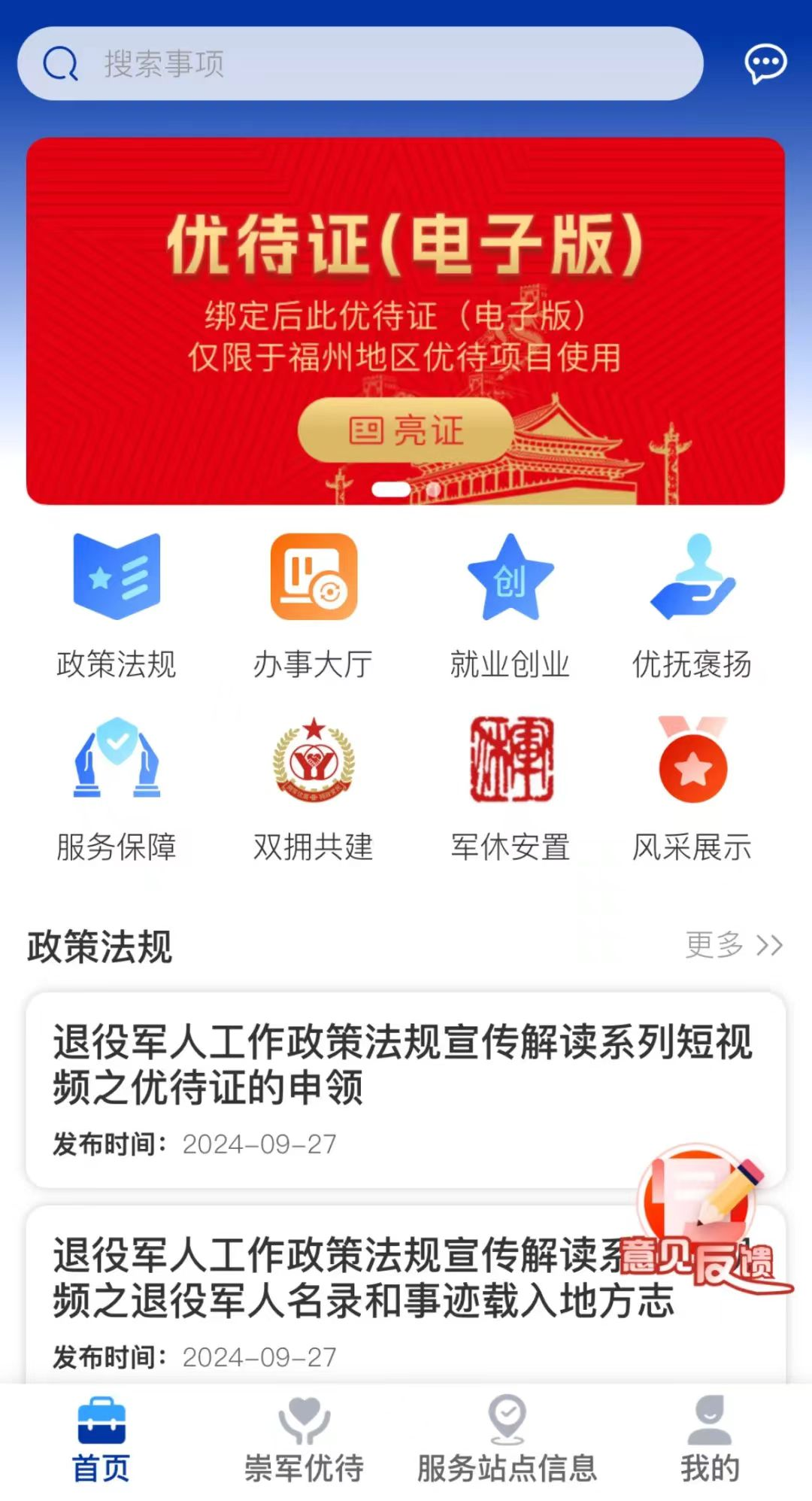 平台首页及办事大厅 “榕城老兵”一体化平台(凯发k8市“网上退役军人事务局”)依托“e凯发k8”APP运行。开设政策法规、办事大厅、就业创业、优抚褒扬、服务保障、双拥共建、军休动态、崇军优待、服务站点信息等服务版块,提供服务中心(站)预约办事、创新创业大赛报名、志愿者注册、光荣牌申领、革命烈士纪念馆预约、宣讲员申请、拥军优属商业联盟申请及查询等服务。 下一步,凯发k8市退役军人事务局将依托“数字凯发k8”建设成果,整合接入更多凯发k8市优待项目和退役军人事务系统综合业务功能,持续强化平台建设,为退役军人提供更加优质、高效的服务保障。 |
