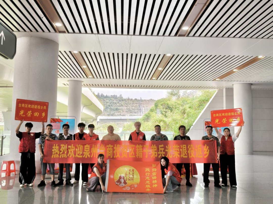 湖里区和海沧区退役军人事务局安排工作人员在高崎国际机场欢迎退役士兵光荣返乡,向退役士兵披绶带、献鲜花,向他们表示热烈的欢迎和诚挚的问候。集美区和同安区退役军人事务局组织街道工作人员,在厦门北站迎接子弟兵光荣返乡,现场准备鲜花、绶带和横幅。思明区和翔安区退役军人事务局在厦门站组织接站,工作人员向退役士兵宣传退役军人服务“一件事”办事流程,帮助他们了解最新政策,助力早日融入社会。 漳州市 9月1日,漳州市退役军人事务局与漳州军分区政治工作处在漳州动车站联合设置接待站及“戎耀门”,精心组织迎接退役士兵返乡,一幕幕温情的场景令人动容。“热烈欢迎漳州退役军人光荣返乡”的背景墙在秋日中格外醒目,庄重而充满乡情的氛围扑面而来。退役士兵抵达后,龙文区退役军人志愿者热情上前迎接,送上一杯家乡的片仔癀甘蔗汁,并提供免费接送服务。 泉州市
