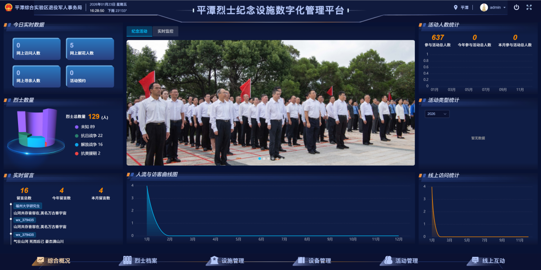 深化数据赋能,重塑管理体系 平台有效打破传统分散化管理壁垒,整合烈士档案、设施设备、纪念活动统筹等核心职能,构建集中化数字化管理体系,实现档案电子化归档、设施“一张图”精准管控、维护全流程可追溯,切实破解信息碎片化、管理粗放化等痛点,推动烈士纪念工作从“粗放式”向“精细化”转型,管理效能显著提升。依托平台多维度数据统计分析功能,实时汇聚祭奠流量、活动参与度、设施运行状态等核心数据,生成可视化分析报表,推动烈士纪念工作决策从“经验判断”向“数据驱动”转变。